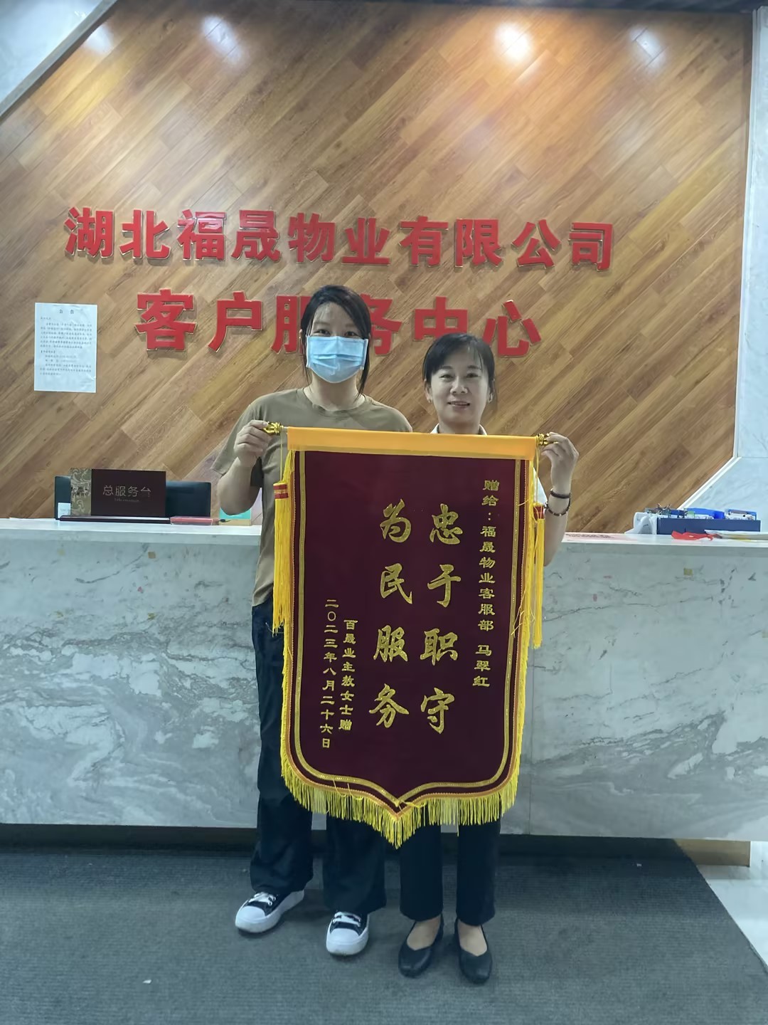 一面錦旗,一聲好評,一份滿意,是對物業(yè)服務(wù)工作人員的最大“褒獎”,每一面錦旗都記錄著感動與溫暖,每一次感謝都承載著認(rèn)可與肯定。8月27日,湖北福晟物業(yè)中心先后走進(jìn)了這樣的兩位業(yè)主,4-2-3002和13-2-1303的業(yè)主心存感恩之意,各自帶著錦旗來到物業(yè)服務(wù)中心,贈予樓管家魏坤珍和馬翠紅。